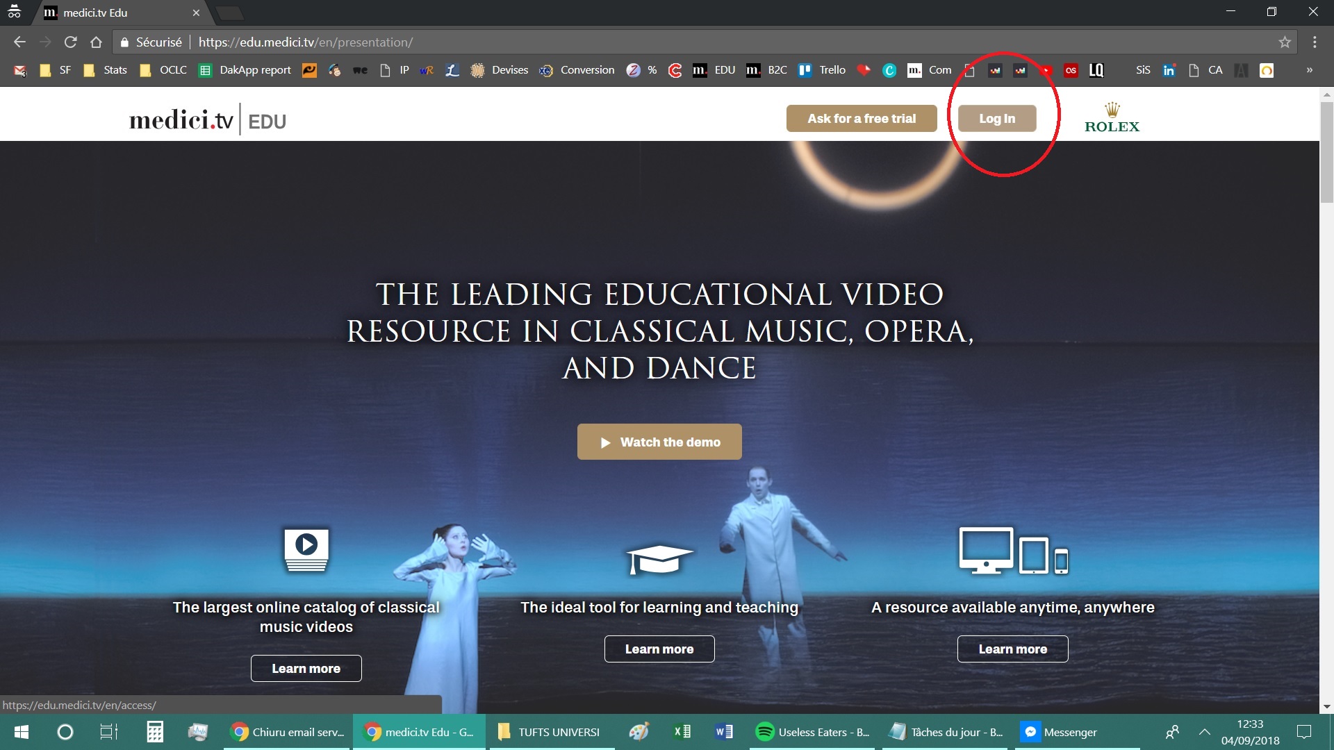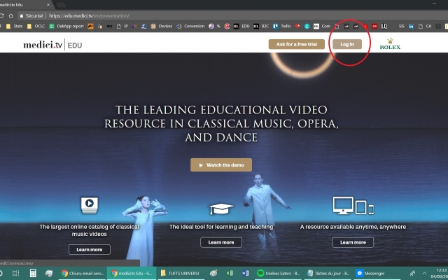 1) 進入Medici.tv的首頁後,點選右上角 "Log in" -> 如截圖 1