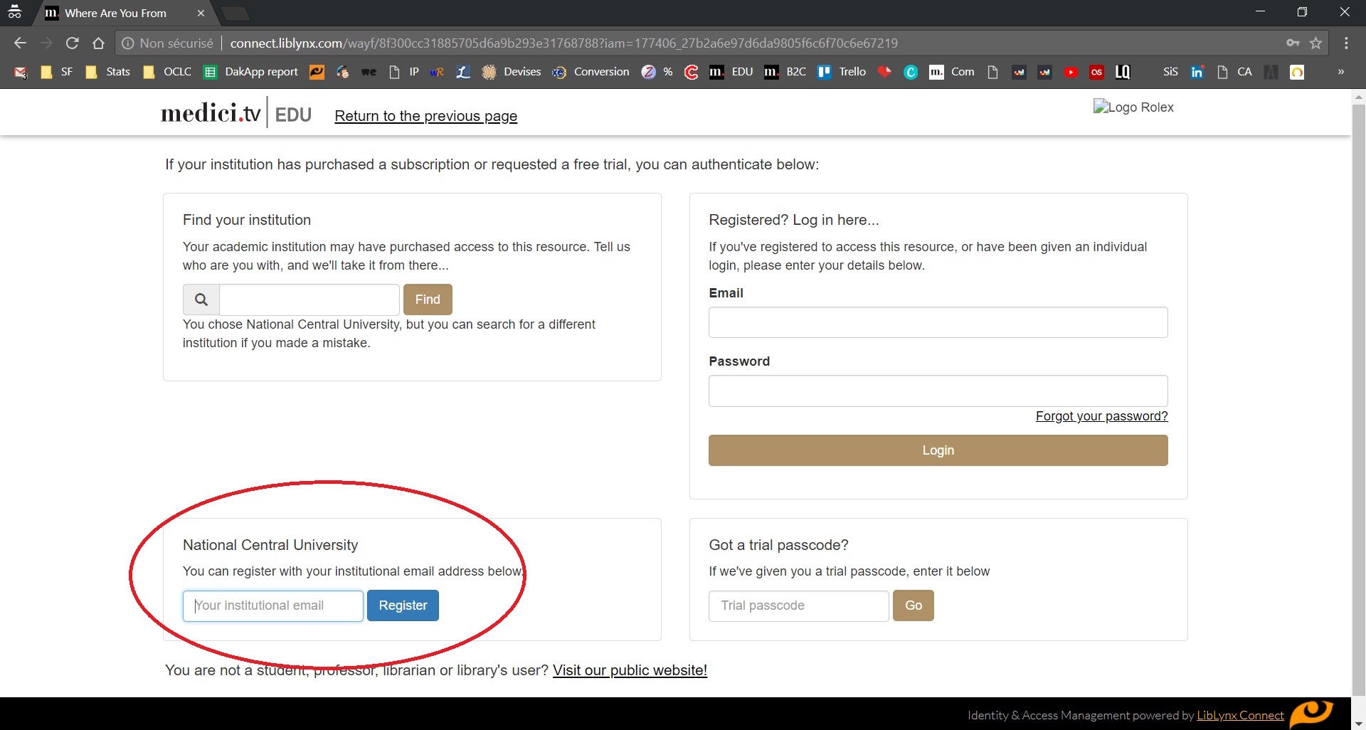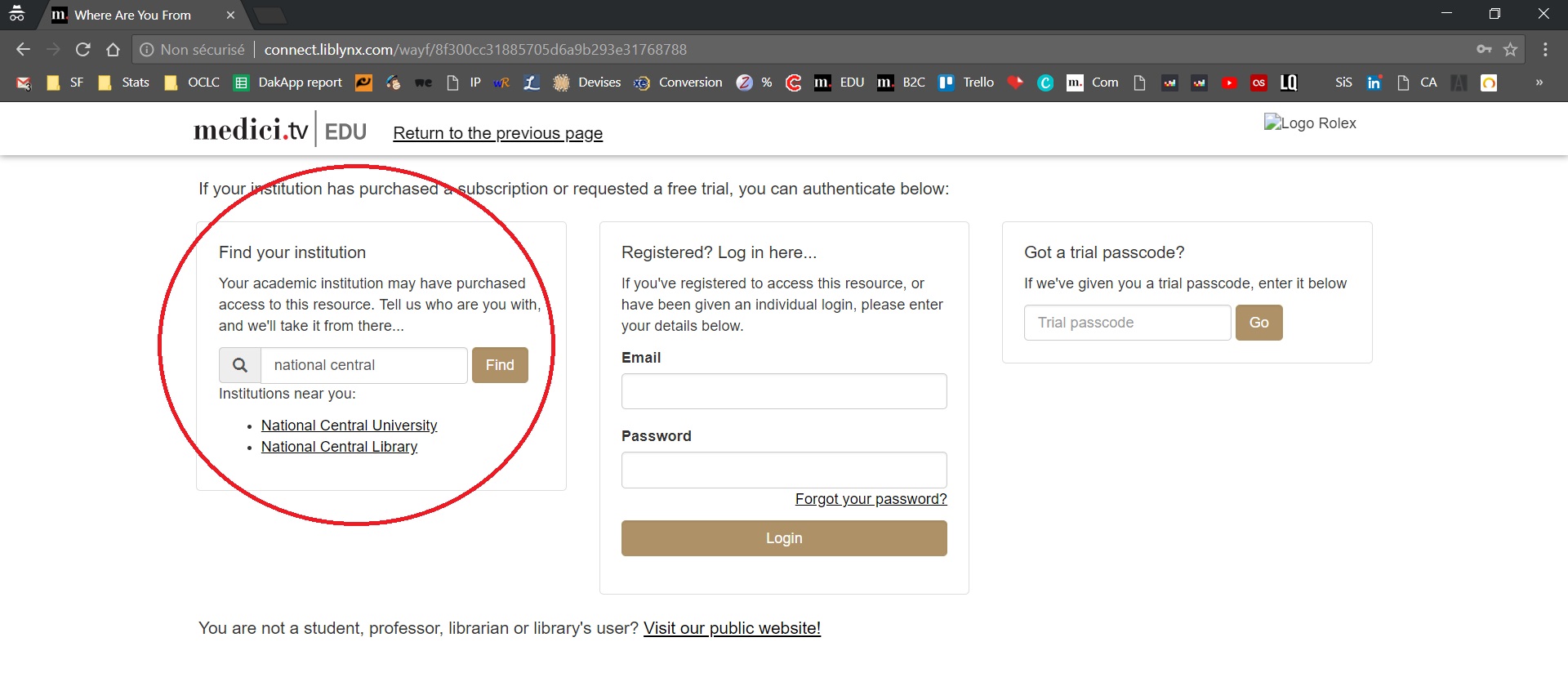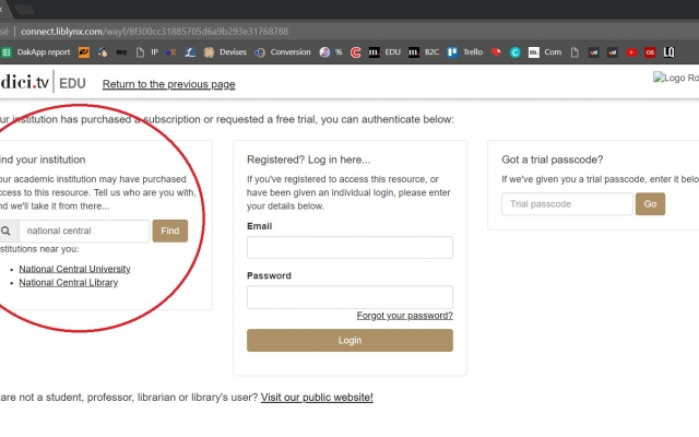 2) 於對話框 "Find your institution", 找到讀者的機構名稱 (可以輸入機構英文名尋找), -> 如截圖 2;