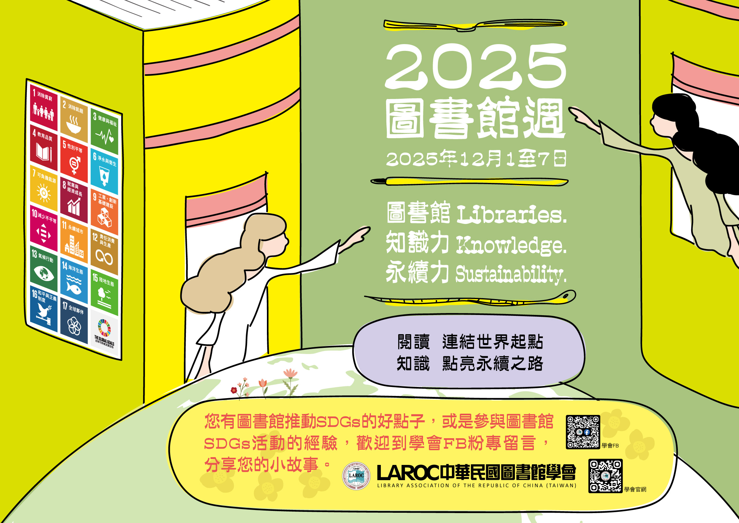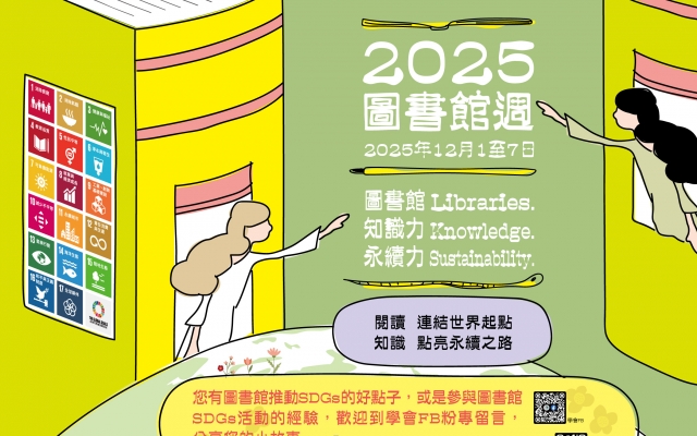 (一)2025圖書館週邀請大家一起來SDGs!今年本會為響應聯合國永續發展目標,特別以「圖書館(Libraries) 知識力(Knowledge) 永續力(Sustainability)--閱讀連結世界起點,知識 點亮永續之路」作為今年圖書館週活動的標語。熱烈邀請圖書館同道及喜愛圖書館的好朋友們,一起來發想SDGs好點子。